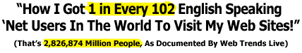But not only will I prove it to you, I'm also going to show and tell you exactly, specifically how I got 1 out of every 102 English speaking 'Net users in the world to visit my web sites.